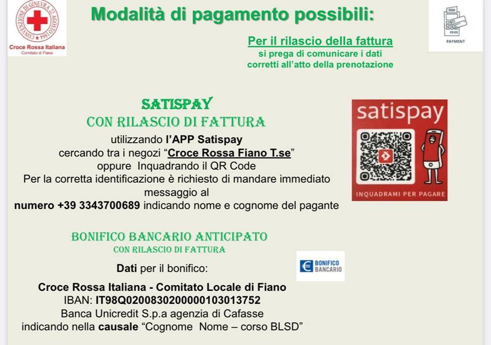 Il costo del corso è di 50 euro da pagare direttamente alla CRI, tramite bonifico o Satispay al momento dell'iscrizione. Il giorno del corso verrà rilasciata la fattura da parte della CRI.