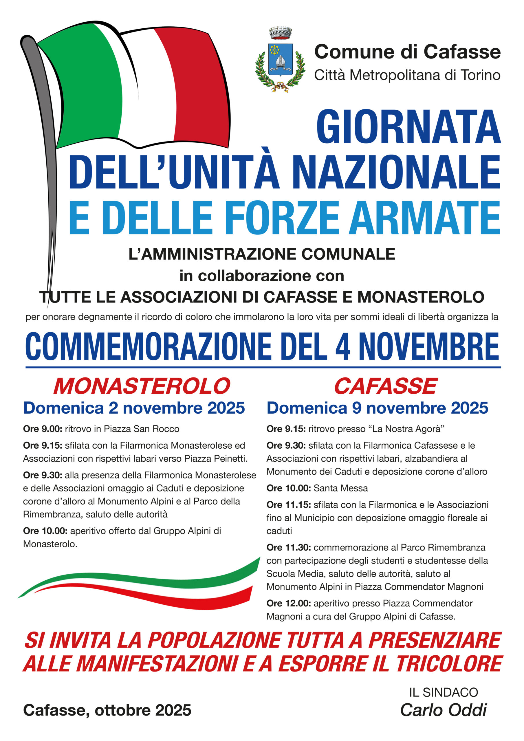 L’amministrazione Comunale in collaborazione con tutte le associazioni di Cafasse e Monasterolo per onorare degnamente il ricordo di coloro che immolarono la loro vita per sommi ideali di libertà organizza la
